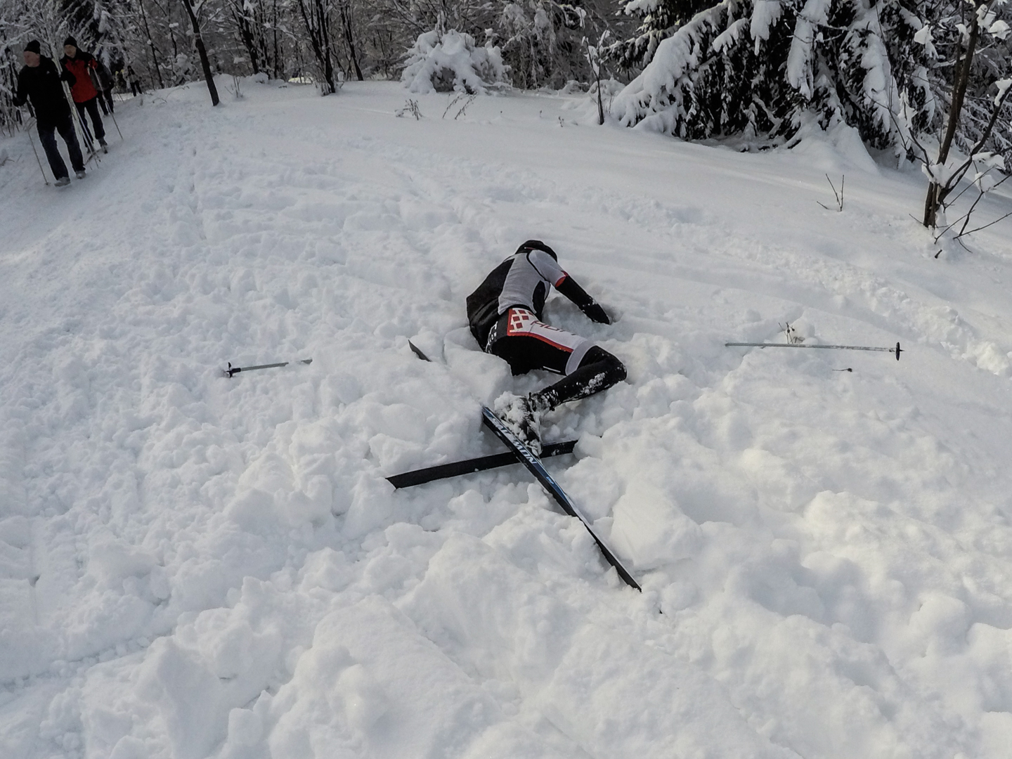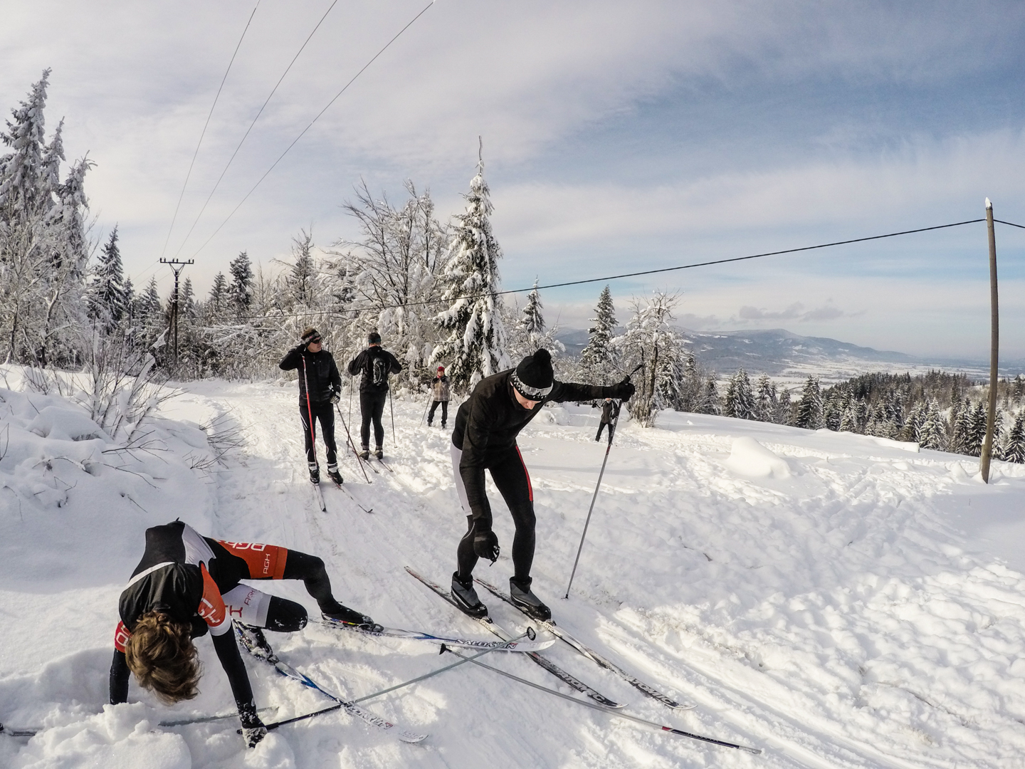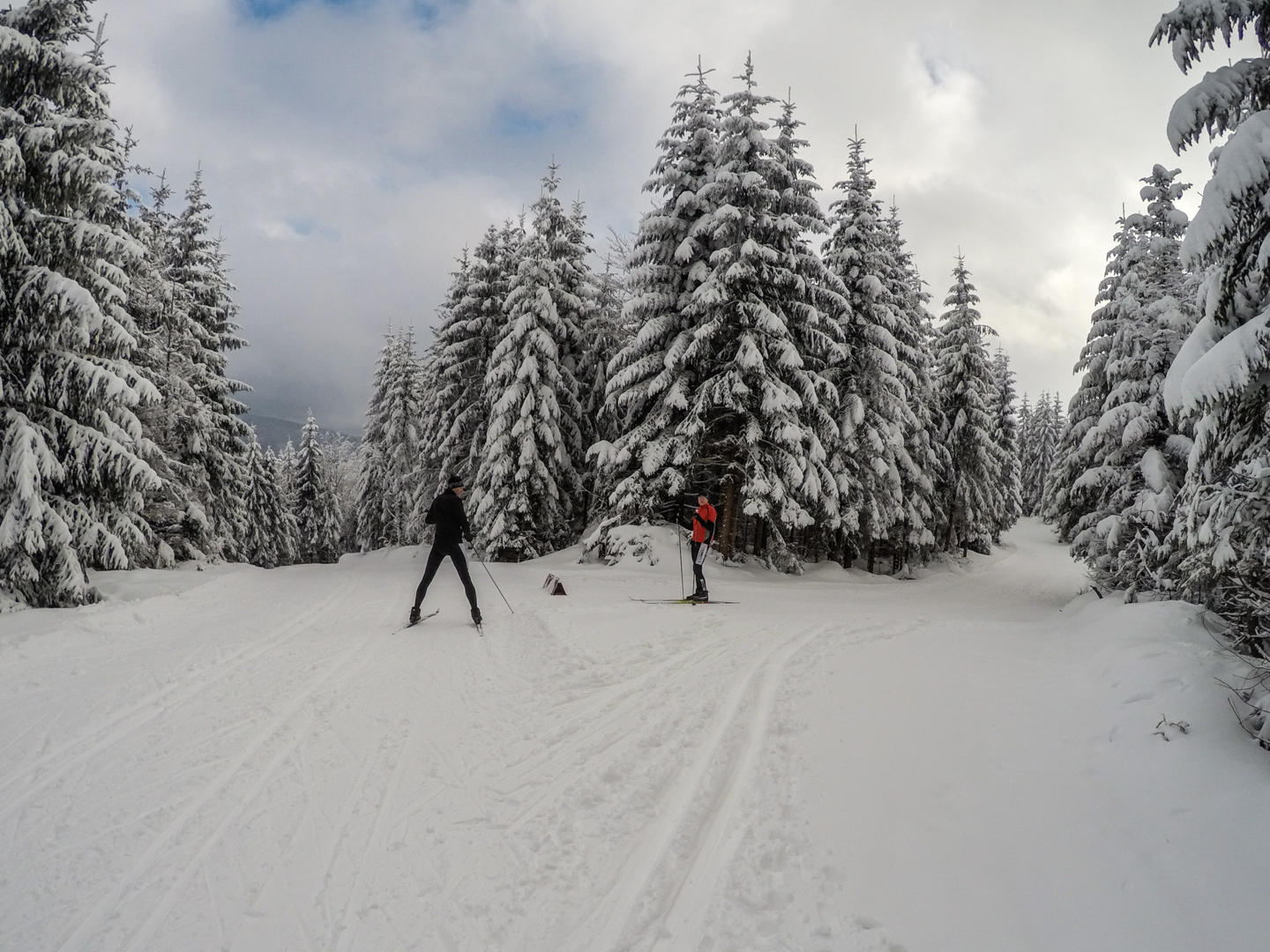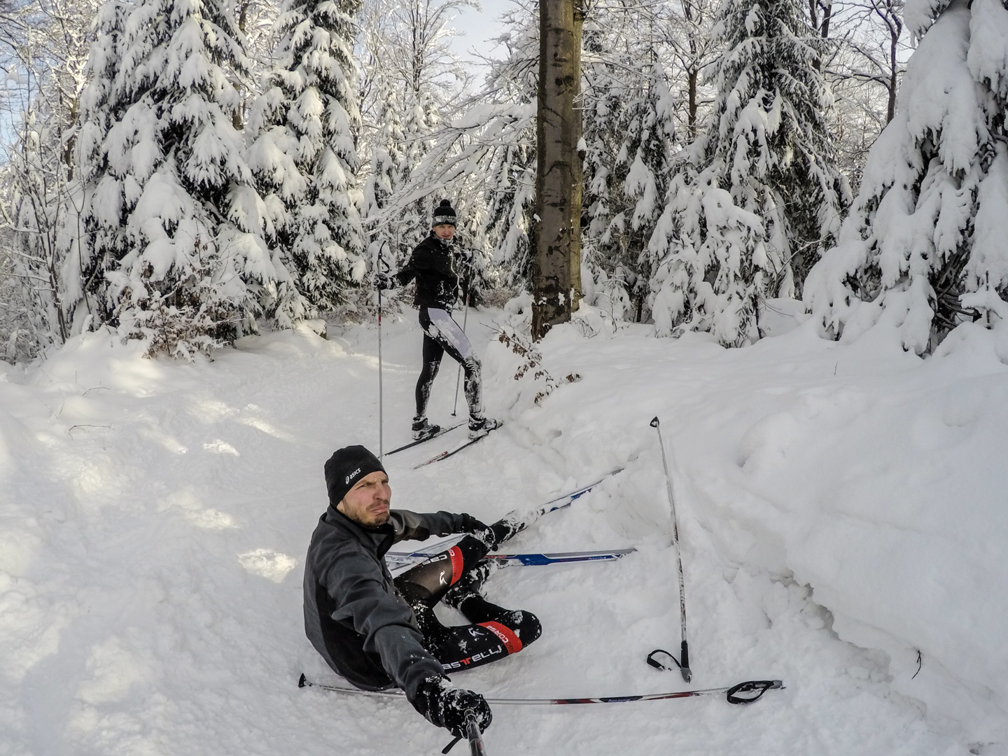 Drugiego dnia budzimy się chwilę po 7 – wczesne zasypianie ma swoje zalety. Decydujemy się zaatakować Czechy – tam przecież, jak już się niejednokrotnie okazywało, wszystko jest prawie takie samo, ale lepsze. Nie mylimy się. 20 kilometrów autem (czyli jakiś 40 minut jazdy, dzięki bardzo luźnemu, czeskiemu podejściu do kwestii odśnieżania dróg) i jesteśmy w miejscowości Mosty u Jablonkova – lokalnym ośrodku narciarskim. Parkujemy jakieś 15 minut spacerem od początku trasy, bo jak prawdziwi Janusze, boimy się znowu zapłacić 5zł parkingowemu. Stoimy tak bardzo w mieście, że chłopaki idą na policję zapytać jak trafić na najbliższą trasę biegową – na szczęście jest niedziela i policja w Czechach chyba nie pracuje, bo komisariat zamknięty. Kierujemy się więc za znalezionymi chwilę później znakami, przedstawiającymi ludzika z nartami biegowymi. W przeciwieństwie do narciarstwa zjazdowego, plusem jest to, że trasy są wszędzie bezpłatne, buty bardzo wygodne, a sprzęt lekki. Mam wrażenie, że szybciej bym się przemieszczał nosząc narty pod pachą. Ruszamy przetartymi szynami w głąb lasu. Potem już tylko podbiegi, zjazdy, punkty widokowe, lasy, pola i wszystko co najlepsze. Opracowaliśmy idealną technikę zjazdową – dzida w dół i na pierwszym zakręcie się wywracamy, żeby nie trafić w drzewo. Biegówki nie skręcają, z tego co widziałem w TV, nawet zawodowcy zakręty pokonują pokracznie. Jako wyznawcy kolarskiej stylówy, wolimy się wywalić, niż tak drętwo skręcać. Metodę dopracowujemy wielokrotnie – w zasadzie, na każdym zjeździe. Czasem też na podjeździe, a pod koniec, nawet stojąc w miejscu. Martwi mnie trochę to, że narty nie wypinają się przy wywrotkach – oczami wyobraźni widzę Maćka z powyłamywanymi kolanami. Wychodzi łącznie 24 kilometry i trochę ponad 4 godziny jazdy. Paweł zapewniał rano, że trasa będzie łatwa i przyjemna. Esencją tego był podjazd zajmujący nam 45 minut, czyli jakieś 4km ze wzniesieniami sięgającymi >25%. Szczęśliwie, nie wziąłem ze sobą batonów, ani picia – nie rozpraszają mnie myśli, o tym kiedy za nie chwycić. Ostatnie kilometry są ciężkie – im bardziej człowiek zmęczony, tym bardziej narta się ślizga. Im bardziej narta się ślizga, tym bardziej człowiek się nie porusza, a im bardziej się nie porusza, tym bardziej jedzie do tyłu zamiast do przodu. Dodatkowo, zapomnieliśmy, że narty trzeba oddać do 16.30 – nie możemy sobie przez to pozwolić na zbyt długie przerwy. Cierpimy w ciszy, przemieszczając się wolno, ale jednolicie.