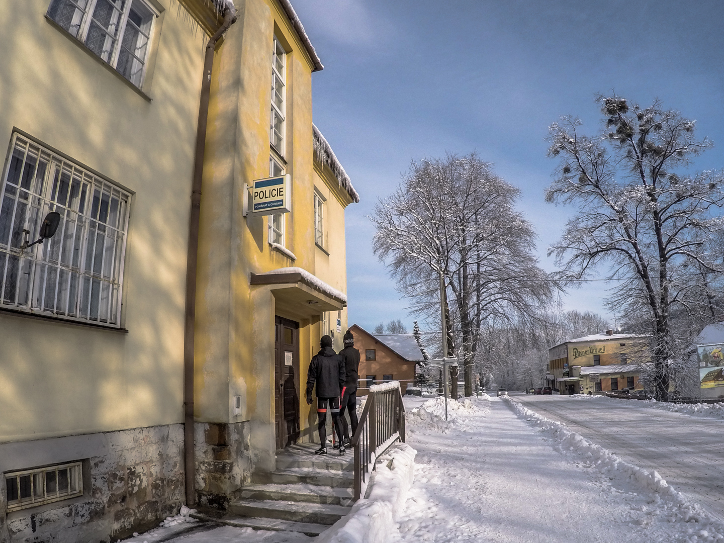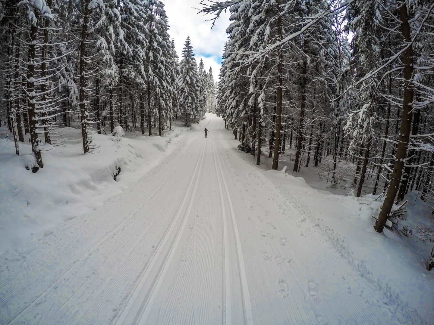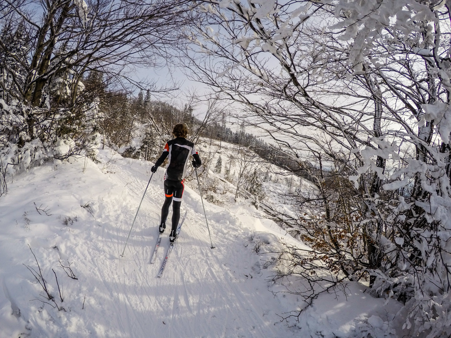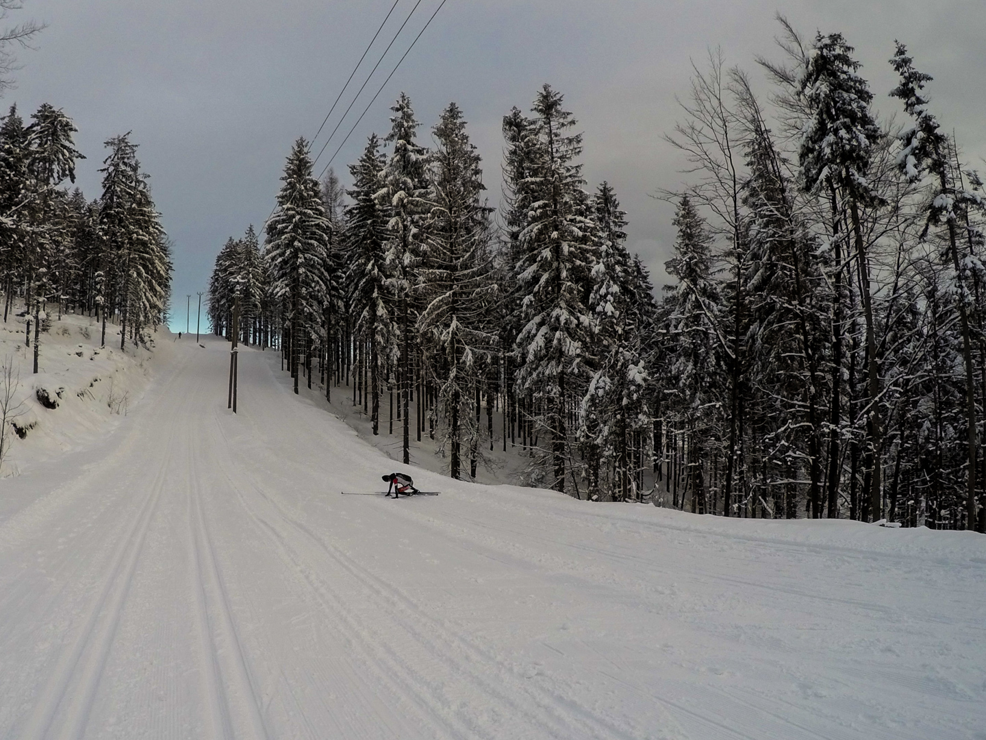 Drugiego dnia budzimy się chwilę po 7 – wczesne zasypianie ma swoje zalety. Decydujemy się zaatakować Czechy – tam przecież, jak już się niejednokrotnie okazywało, wszystko jest prawie takie samo, ale lepsze. Nie mylimy się. 20 kilometrów autem (czyli jakiś 40 minut jazdy, dzięki bardzo luźnemu, czeskiemu podejściu do kwestii odśnieżania dróg) i jesteśmy w miejscowości Mosty u Jablonkova – lokalnym ośrodku narciarskim. Parkujemy jakieś 15 minut spacerem od początku trasy, bo jak prawdziwi Janusze, boimy się znowu zapłacić 5zł parkingowemu. Stoimy tak bardzo w mieście, że chłopaki idą na policję zapytać jak trafić na najbliższą trasę biegową – na szczęście jest niedziela i policja w Czechach chyba nie pracuje, bo komisariat zamknięty. Kierujemy się więc za znalezionymi chwilę później znakami, przedstawiającymi ludzika z nartami biegowymi. W przeciwieństwie do narciarstwa zjazdowego, plusem jest to, że trasy są wszędzie bezpłatne, buty bardzo wygodne, a sprzęt lekki. Mam wrażenie, że szybciej bym się przemieszczał nosząc narty pod pachą. Ruszamy przetartymi szynami w głąb lasu. Potem już tylko podbiegi, zjazdy, punkty widokowe, lasy, pola i wszystko co najlepsze. Opracowaliśmy idealną technikę zjazdową – dzida w dół i na pierwszym zakręcie się wywracamy, żeby nie trafić w drzewo. Biegówki nie skręcają, z tego co widziałem w TV, nawet zawodowcy zakręty pokonują pokracznie. Jako wyznawcy kolarskiej stylówy, wolimy się wywalić, niż tak drętwo skręcać. Metodę dopracowujemy wielokrotnie – w zasadzie, na każdym zjeździe. Czasem też na podjeździe, a pod koniec, nawet stojąc w miejscu. Martwi mnie trochę to, że narty nie wypinają się przy wywrotkach – oczami wyobraźni widzę Maćka z powyłamywanymi kolanami. Wychodzi łącznie 24 kilometry i trochę ponad 4 godziny jazdy. Paweł zapewniał rano, że trasa będzie łatwa i przyjemna. Esencją tego był podjazd zajmujący nam 45 minut, czyli jakieś 4km ze wzniesieniami sięgającymi >25%. Szczęśliwie, nie wziąłem ze sobą batonów, ani picia – nie rozpraszają mnie myśli, o tym kiedy za nie chwycić. Ostatnie kilometry są ciężkie – im bardziej człowiek zmęczony, tym bardziej narta się ślizga. Im bardziej narta się ślizga, tym bardziej człowiek się nie porusza, a im bardziej się nie porusza, tym bardziej jedzie do tyłu zamiast do przodu. Dodatkowo, zapomnieliśmy, że narty trzeba oddać do 16.30 – nie możemy sobie przez to pozwolić na zbyt długie przerwy. Cierpimy w ciszy, przemieszczając się wolno, ale jednolicie.