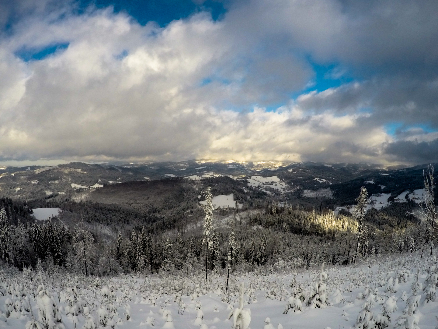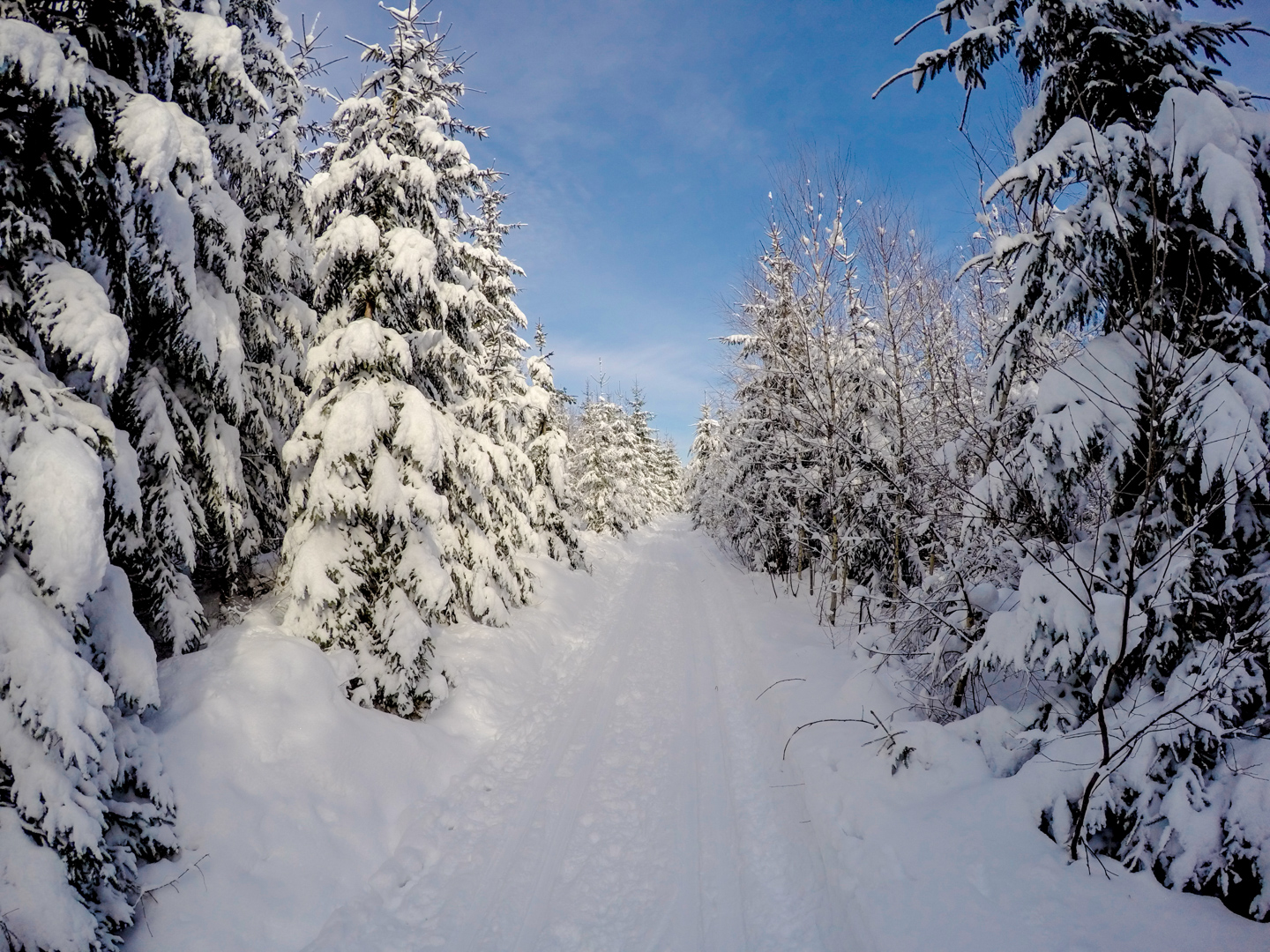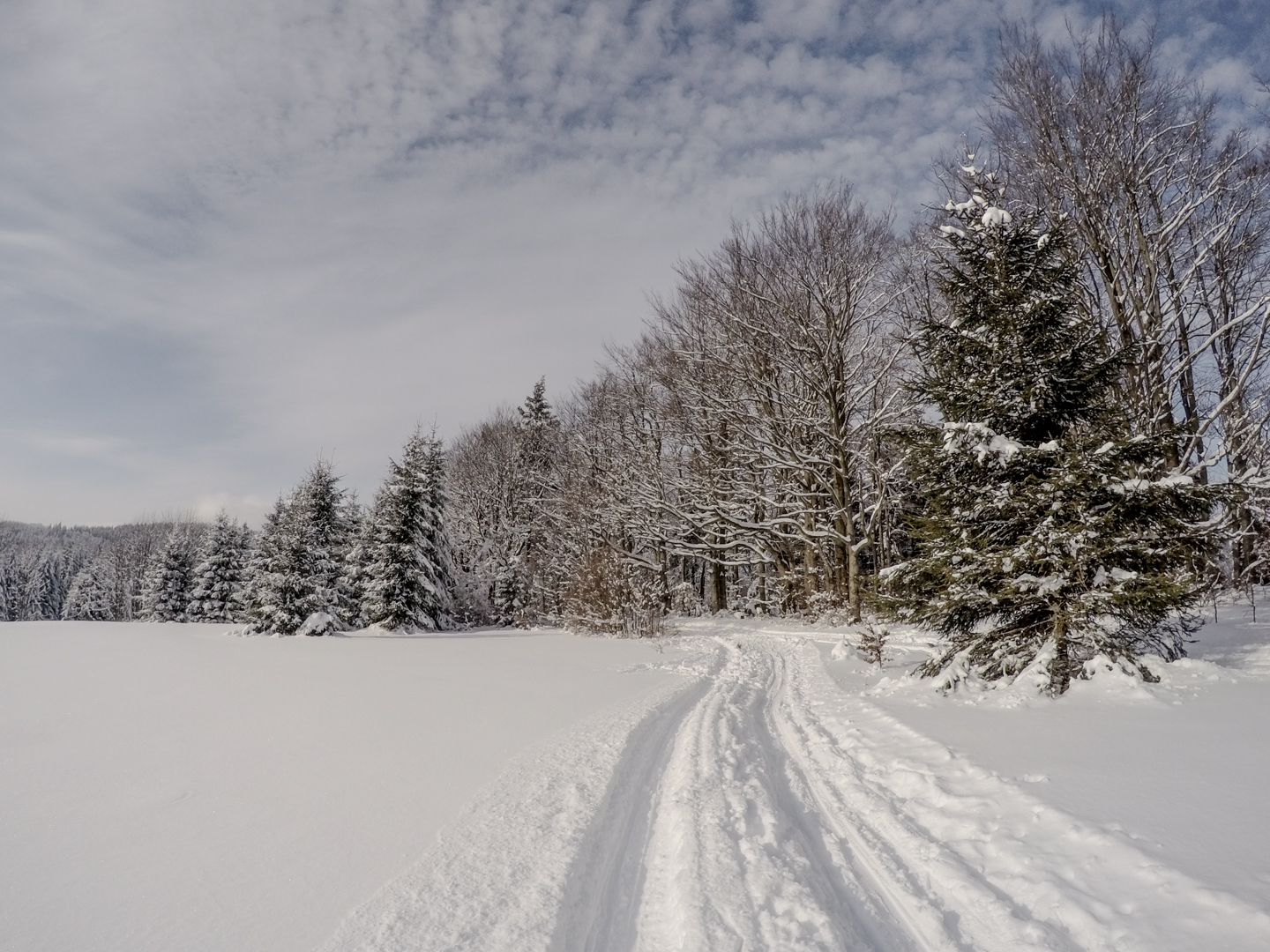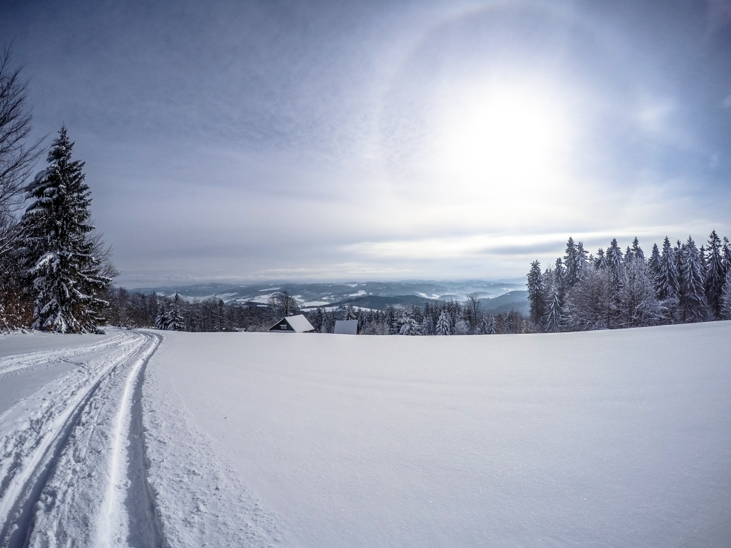 Drugiego dnia budzimy się chwilę po 7 – wczesne zasypianie ma swoje zalety. Decydujemy się zaatakować Czechy – tam przecież, jak już się niejednokrotnie okazywało, wszystko jest prawie takie samo, ale lepsze. Nie mylimy się. 20 kilometrów autem (czyli jakiś 40 minut jazdy, dzięki bardzo luźnemu, czeskiemu podejściu do kwestii odśnieżania dróg) i jesteśmy w miejscowości Mosty u Jablonkova – lokalnym ośrodku narciarskim. Parkujemy jakieś 15 minut spacerem od początku trasy, bo jak prawdziwi Janusze, boimy się znowu zapłacić 5zł parkingowemu. Stoimy tak bardzo w mieście, że chłopaki idą na policję zapytać jak trafić na najbliższą trasę biegową – na szczęście jest niedziela i policja w Czechach chyba nie pracuje, bo komisariat zamknięty. Kierujemy się więc za znalezionymi chwilę później znakami, przedstawiającymi ludzika z nartami biegowymi. W przeciwieństwie do narciarstwa zjazdowego, plusem jest to, że trasy są wszędzie bezpłatne, buty bardzo wygodne, a sprzęt lekki. Mam wrażenie, że szybciej bym się przemieszczał nosząc narty pod pachą. Ruszamy przetartymi szynami w głąb lasu. Potem już tylko podbiegi, zjazdy, punkty widokowe, lasy, pola i wszystko co najlepsze. Opracowaliśmy idealną technikę zjazdową – dzida w dół i na pierwszym zakręcie się wywracamy, żeby nie trafić w drzewo. Biegówki nie skręcają, z tego co widziałem w TV, nawet zawodowcy zakręty pokonują pokracznie. Jako wyznawcy kolarskiej stylówy, wolimy się wywalić, niż tak drętwo skręcać. Metodę dopracowujemy wielokrotnie – w zasadzie, na każdym zjeździe. Czasem też na podjeździe, a pod koniec, nawet stojąc w miejscu. Martwi mnie trochę to, że narty nie wypinają się przy wywrotkach – oczami wyobraźni widzę Maćka z powyłamywanymi kolanami. Wychodzi łącznie 24 kilometry i trochę ponad 4 godziny jazdy. Paweł zapewniał rano, że trasa będzie łatwa i przyjemna. Esencją tego był podjazd zajmujący nam 45 minut, czyli jakieś 4km ze wzniesieniami sięgającymi >25%. Szczęśliwie, nie wziąłem ze sobą batonów, ani picia – nie rozpraszają mnie myśli, o tym kiedy za nie chwycić. Ostatnie kilometry są ciężkie – im bardziej człowiek zmęczony, tym bardziej narta się ślizga. Im bardziej narta się ślizga, tym bardziej człowiek się nie porusza, a im bardziej się nie porusza, tym bardziej jedzie do tyłu zamiast do przodu. Dodatkowo, zapomnieliśmy, że narty trzeba oddać do 16.30 – nie możemy sobie przez to pozwolić na zbyt długie przerwy. Cierpimy w ciszy, przemieszczając się wolno, ale jednolicie.