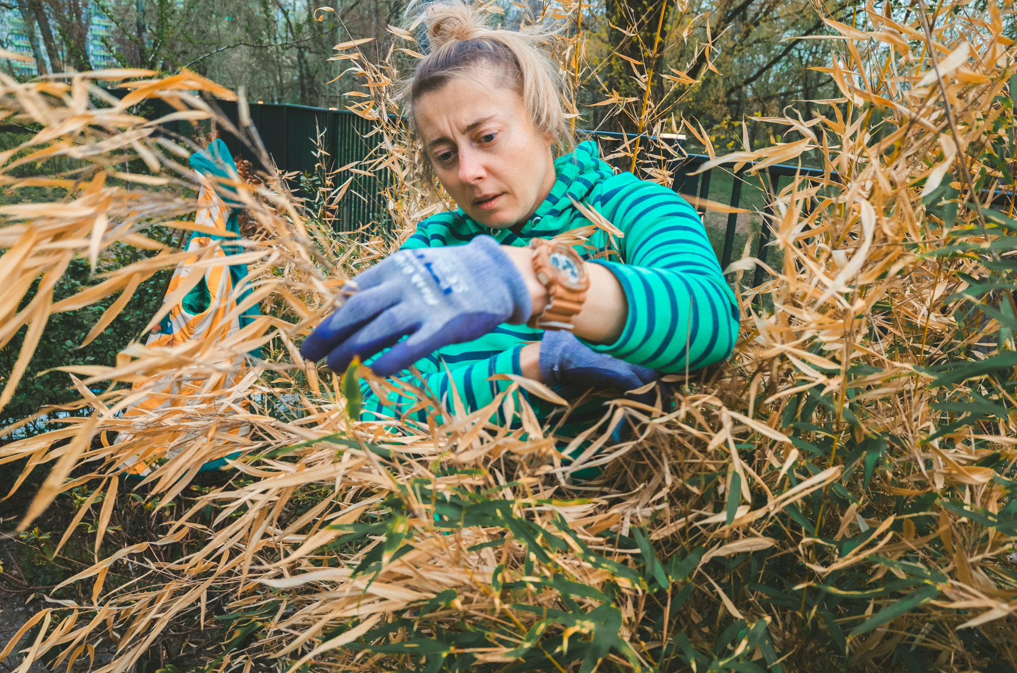 Tu Sylwia przedziera się przez afrykańskie bambusy. Co prawda bambusy pochodzą głównie z prowincji Syczuan w Chinach, a sytuacja ma miejscu u nas w ogródku, ale może nie doczytacie podpisu.