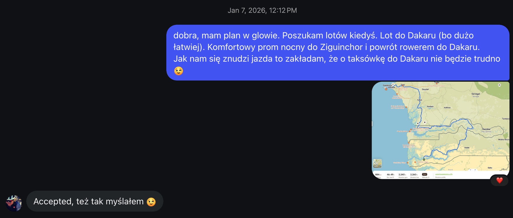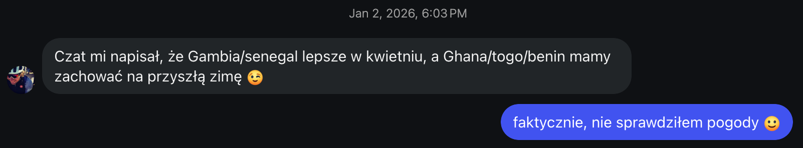 A wada ta była delikatnie ukryta, więc wpadam na nią nieco przypadkiem. Starałem się bowiem zlokalizować na mapie owe rondo papieża, aby zagwiazdkować i odwiedzić. Kliknałem przez to na miejscowość Ziguinchor na Google Maps, a one wyświetlają wtedy również aktualną pogodę. No i patrzę, a tam 39°C, mimo że jest już wieczór. Klikam więc na pałę w kilka miejscowości, przez które mogłaby przebiegać nasza trasa, a w każdej z nim przynajmniej przez kilka godzin dziennie temperatura przekracza 40°C. Młodzież (ta w przeszłości) określiłaby wtedy moją minę na: PRZYPAŁ.