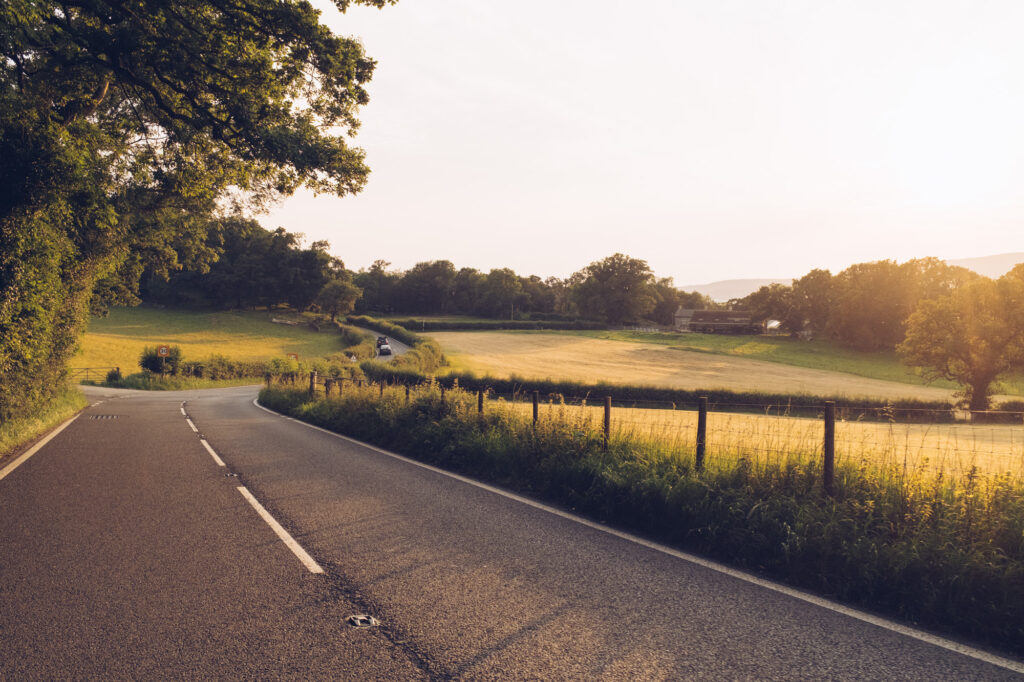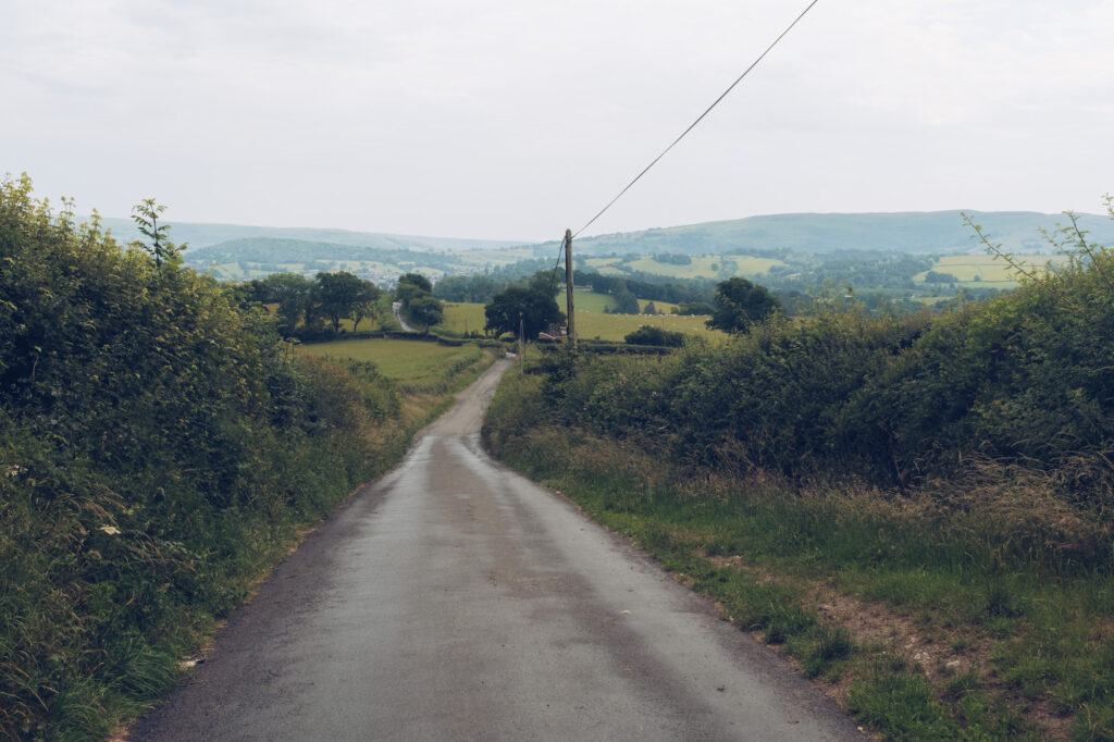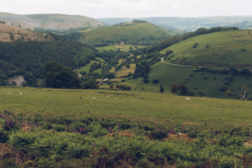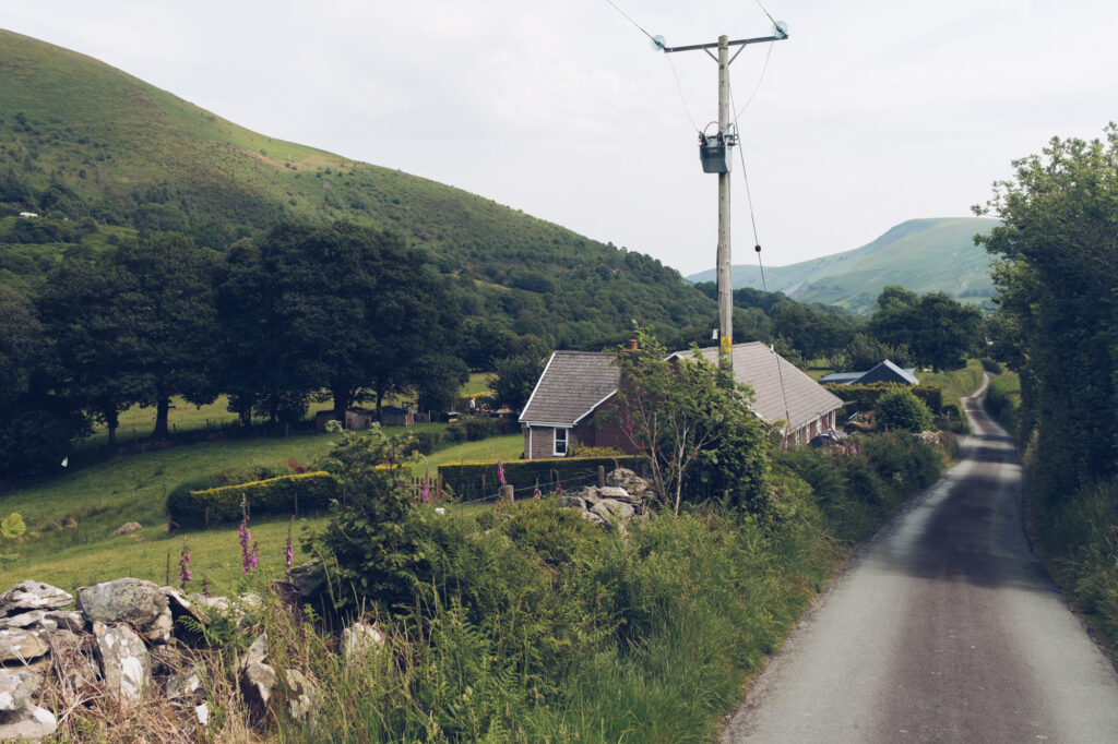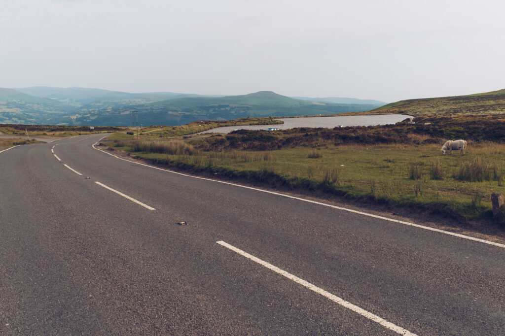 Przez kolejne 100km nie ma w zasadzie niczego ciekawego. Jadę stosunkowo pustą drogą przez pola i niewielkie lasy. Dopiero pod koniec dnia zaczynają się górki i ciekawsze widoki. To dlatego, że jadę wzdłuż Parku Narodowego Brecon Beacons – prawdopodobnie drugiego, najbardziej znanego w kraju – po Snowdonii. Jest on jednak zdecydowanie mniej imponujący – przynajmniej z perspektywy asfaltowej drogi.