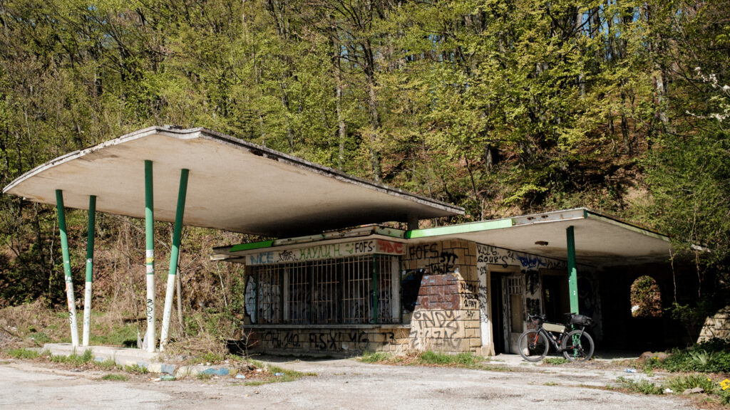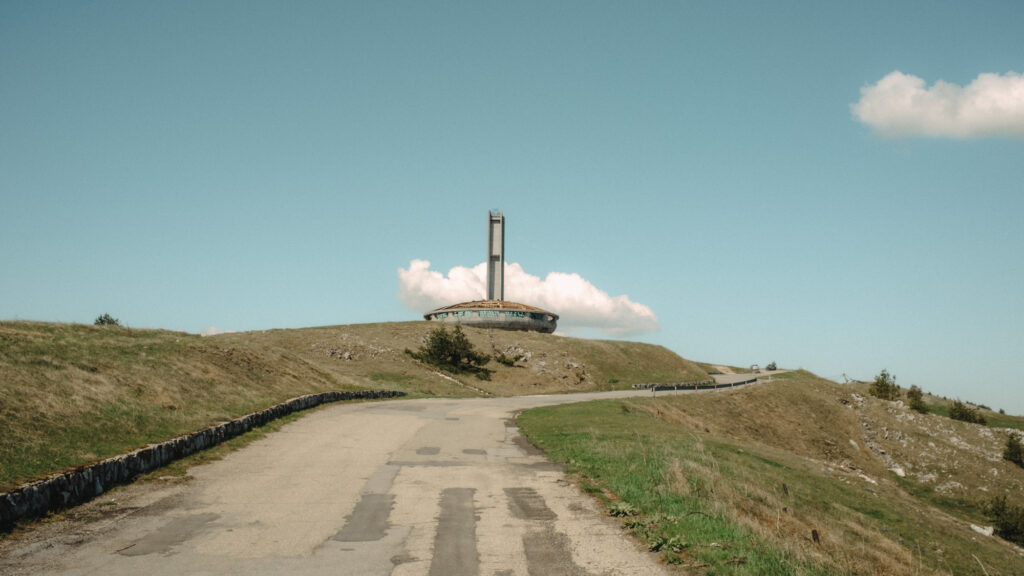 Dzień sinusoida. Zaczyna się bowiem wysokim na tysiąc metrów podjazdem, stanowiącym clue całej wycieczki. Bo jeśli jakieś miejsce w Bułgarii, poza Słonecznym Brzegiem jest znane, to jest to brutalistyczny pomnik Komunistycznej Partii Bułgarii: Buzludzha Monument. To jedyne miejsce, które miałem zagwiadkowane na mapach google’a, zanim jeszcze pomyślałem o odwiedzeniu kiedykolwiek tego kraju. Moje wyobrażenie o popularności tego miejsca i wątpliwości związane z pokonywaniem podjazdu główną drogą nieco rozminęły się z rzeczywistością. Na szczycie spotykam bowiem tak ze 3 turystów i jednego człowieka rozstawiającego samochodowe stoisko z magnesami i kubkami.