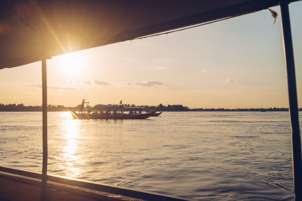 The next day is another 100km north. The same, though a bit more Muslim and even more rural. To add variety, we sometimes leave the asphalt in favor of red gravel roads – very good, by the way, although if it had been raining, I would definitely say differently. Carried by sugar balls made from tea, we reach Krâchéh. It's no coincidence that I chose this town as my destination. Apparently, it's there, just north of the town, you can find animals called "Irrawaddy dolphins." In our language, they're called the Irrawaddy dolphin, and they look fantastic. Apparently, there are only a few dozen left in the Mekong, so I don't have high expectations. It's enough for me that I learned about their existence and saw them in What do they look like on the Internet?. They look as if I molded my index finger out of modeling clay and then drew eyes, fins, and a smiling face on it.