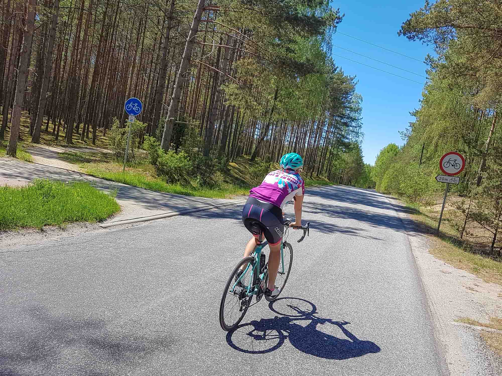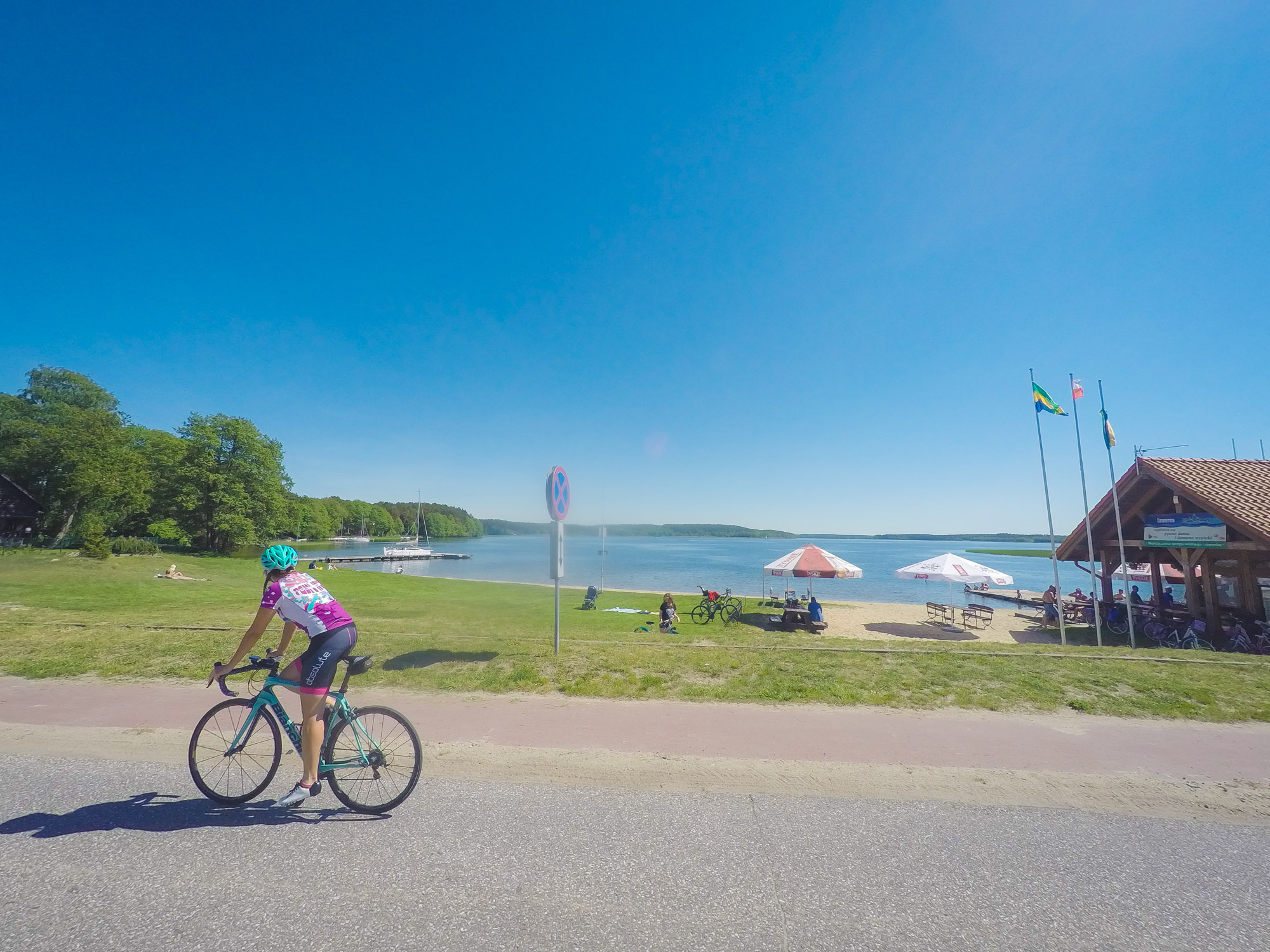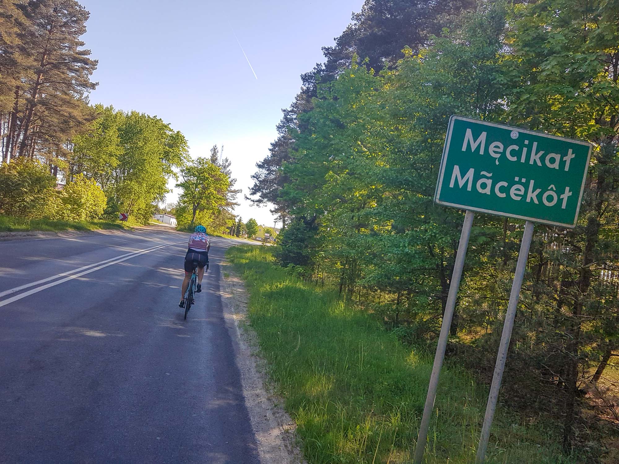 Lekkim problemem może być tu jednak fakt, że na wielu odcinkach jest zakaz jazdy rowerem, pomimo minimalnego ruchu. Auta mijają nas pojedynczo co kilka-kilkanaście minut. Jaki jest więc sens zakazu? Okolica to jednak miejsca dla ludzi na wakacjach, z dziećmi, z trekkingami, z rowerami miejskimi albo najpopularniejszymi – MTB. Obok tych idealnie równych asfaltów prowadzą specjalnie przygotowane dla cyklistów ścieżki przez las – równe, ale jednak terenowe. Na rodzinne wypady lub cykloturystykę idealne, dla szosowca już nie bardzo. Ale to nieistotne, na Kaszebe Runda jedziemy ulicą.