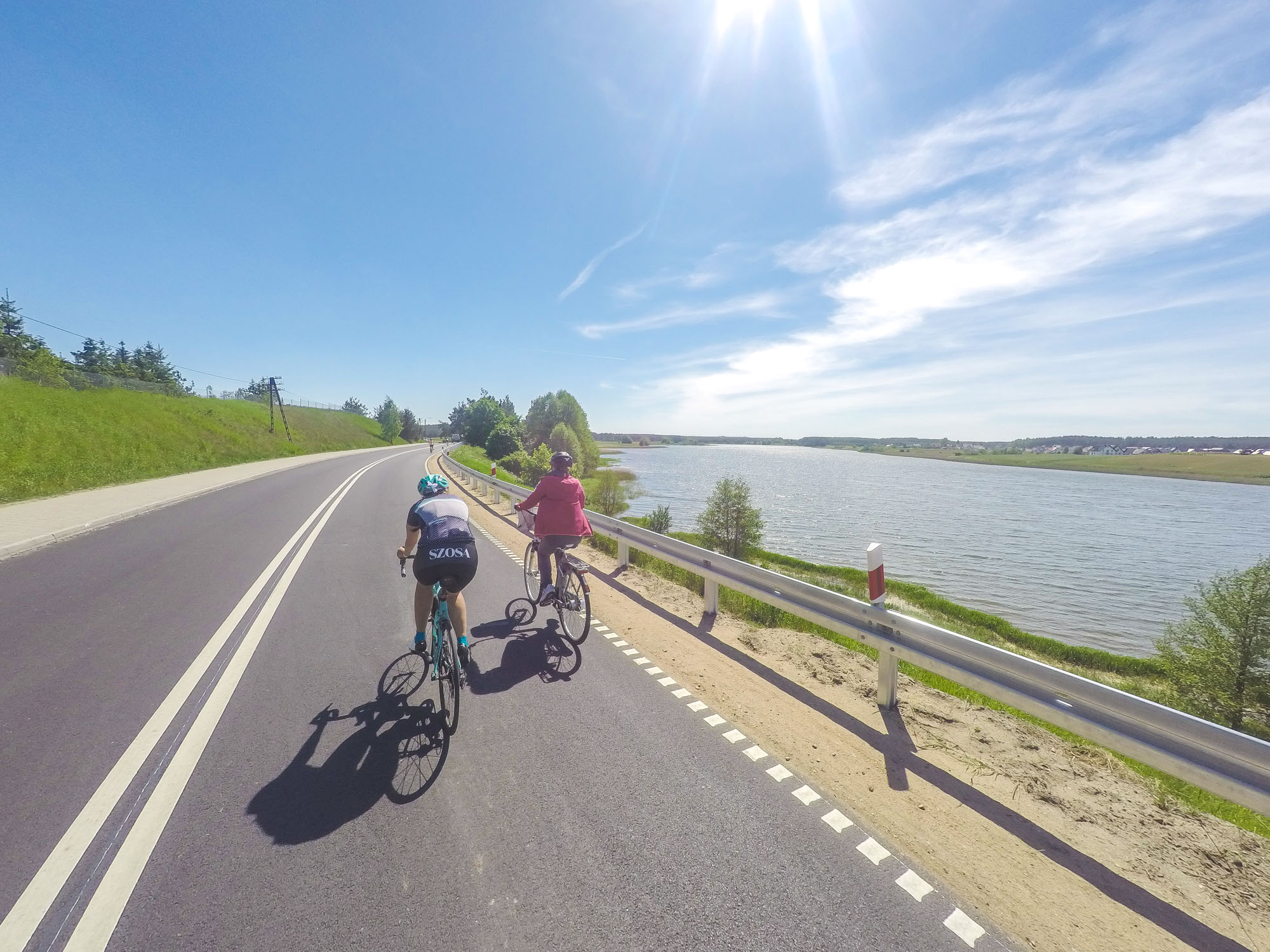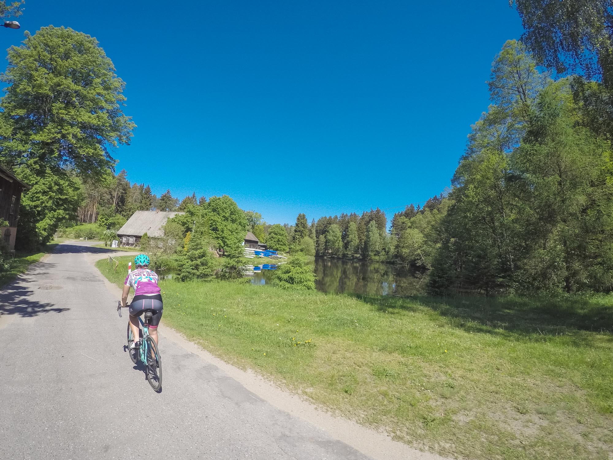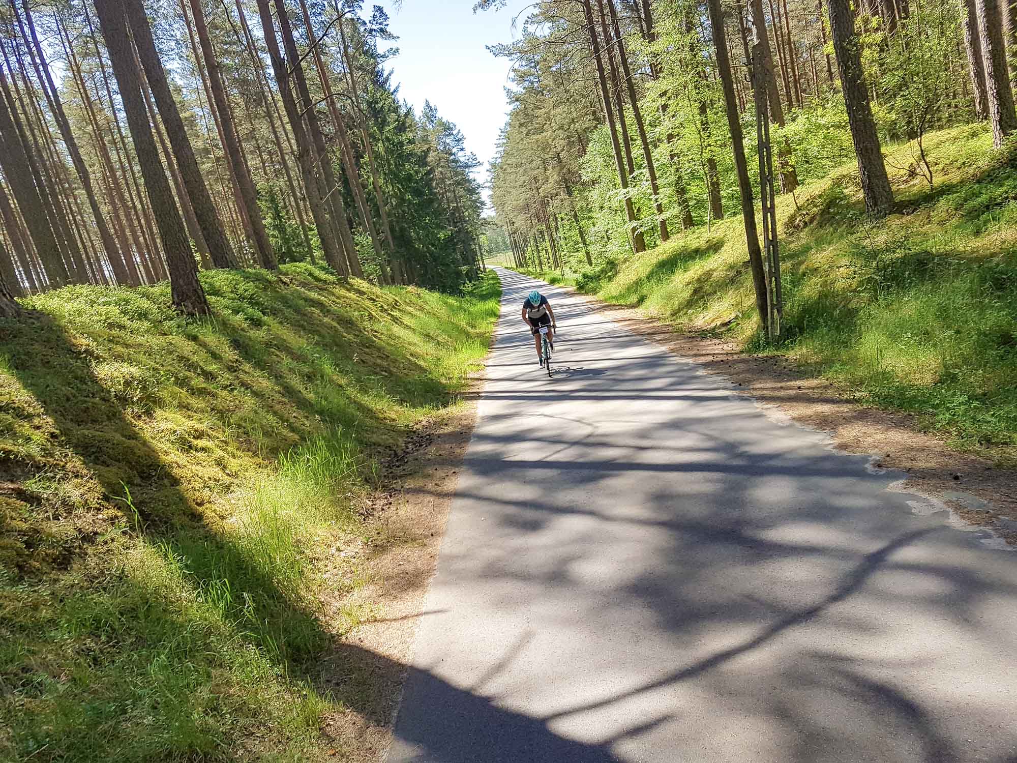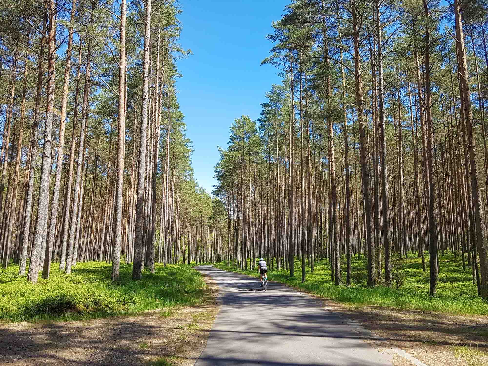 Lekkim problemem może być tu jednak fakt, że na wielu odcinkach jest zakaz jazdy rowerem, pomimo minimalnego ruchu. Auta mijają nas pojedynczo co kilka-kilkanaście minut. Jaki jest więc sens zakazu? Okolica to jednak miejsca dla ludzi na wakacjach, z dziećmi, z trekkingami, z rowerami miejskimi albo najpopularniejszymi – MTB. Obok tych idealnie równych asfaltów prowadzą specjalnie przygotowane dla cyklistów ścieżki przez las – równe, ale jednak terenowe. Na rodzinne wypady lub cykloturystykę idealne, dla szosowca już nie bardzo. Ale to nieistotne, na Kaszebe Runda jedziemy ulicą.